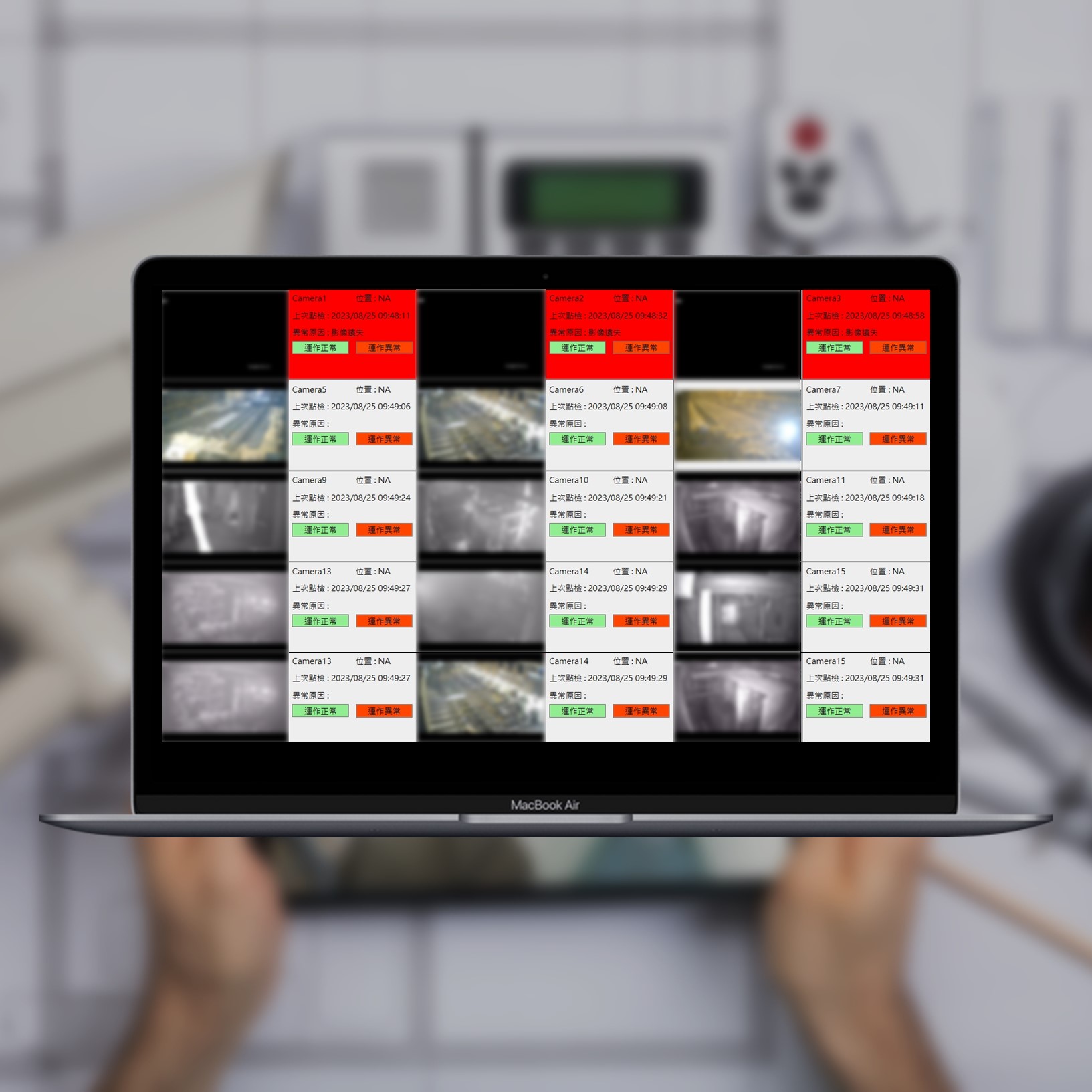 當監視器畫面出現全黑或異常時,點擊 "運作異常" 按鈕,即觸發異常報告,後續將作為異常分析和報告的重要依據。